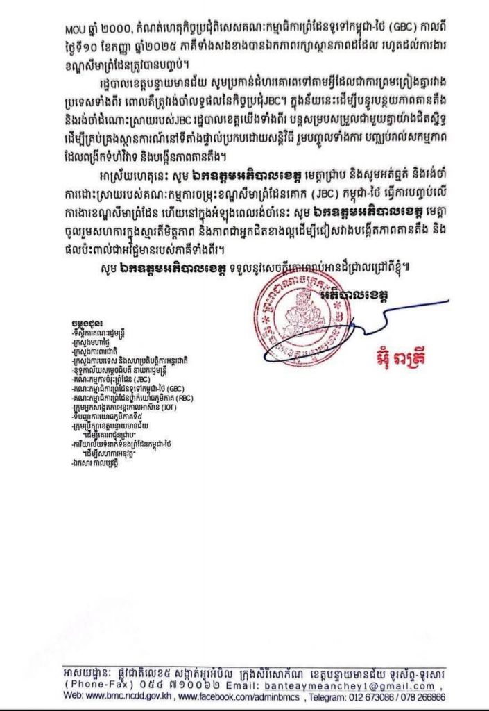 (ភ្នំពេញ)៖ តាមរយៈលិខិតចុះថ្ងៃទី៨ ខែតុលា ឆ្នាំ២០២៥ លោក អ៊ុំ រាត្រី អភិបាលខេត្តបន្ទាយមានជ័យរបស់កម្ពុជា ផ្ញើជូនលោកអភិបាលខេត្តស្រះកែវរបស់ថៃ, ភាគីកម្ពុជាបញ្ជាក់ថា ទីតាំងដែលរដ្ឋបាលខេត្តស្រះកែវបានតវ៉ា គឺស្ថិតក្នុងភូមិជោគជ័យ ឃុំអូរបីជាន់ ស្រុកអូរជ្រៅ ខេត្តបន្ទាយមានជ័យ ហើយទីតាំងនេះប្រជាពលរដ្ឋកម្ពុជាបានរស់នៅ កាន់កាប់ និងប្រើប្រាស់អាស្រ័យផលជាយូរមកហើយ មុនការចូលជាធរមាន MOU ឆ្នាំ២០០០។