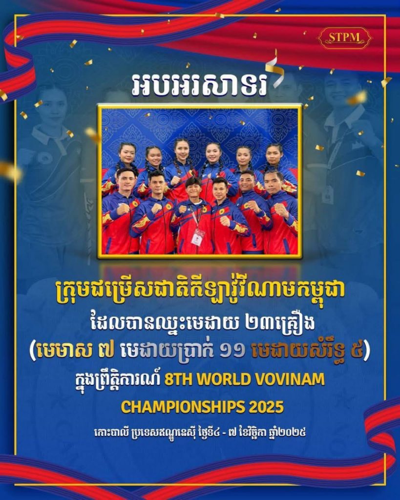 អបអរសាទរ ក្រុមជម្រើសជាតិកីឡាវ៉ូវីណាមកម្ពុជា ដែលបានឈ្នះមេដាយ ២៣គ្រឿង (មេដាយមាស ៧ មេដាយប្រាក់ ១១ មេដាយសំរឹទ្ធ៥) ក្នុងព្រឹត្តិការណ៍ 8TH WORLD VOVINAM CHAMPIONSHIPS 2025កោះបាលី ប្រទេសឥណ្ឌូនេស៊ី ថ្ងៃទី៤ ដល់ថ្ងៃទី៧ ខែវិច្ឆិកា ឆ្នាំ២០២៥៕