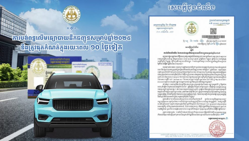 (ភ្នំំពេញ)៖ ការបង់ពន្ធលើមធ្យោបាយដឹកជញ្ជូនឆ្នាំ២០២៥ នឹងត្រូវបិទបញ្ចប់ នៅថ្ងៃទី៣០ ខែវិច្ឆិកា ឆ្នាំ២០២៥ ខាងមុខនេះ ពោលគឺនៅសល់ពេលតែ១០ថ្ងៃទៀតប៉ុណ្ណោះ។