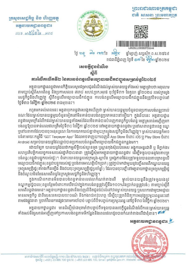 កាលពីថ្ងៃទី១៧ ខែវិច្ឆិកា ឆ្នាំ២០២៥ អគ្គនាយកដ្ឋានពន្ធដារ បានចេញសេចក្តីជូនដំណឹង ក្រើនរំលឹកជាលើកទី២ ដល់ម្ចាស់យានយន្តទាំងអស់ពីការពន្ធលើមធ្យោបាយដឹកជញ្ជូន ឱ្យទាន់ពេលវេលា។