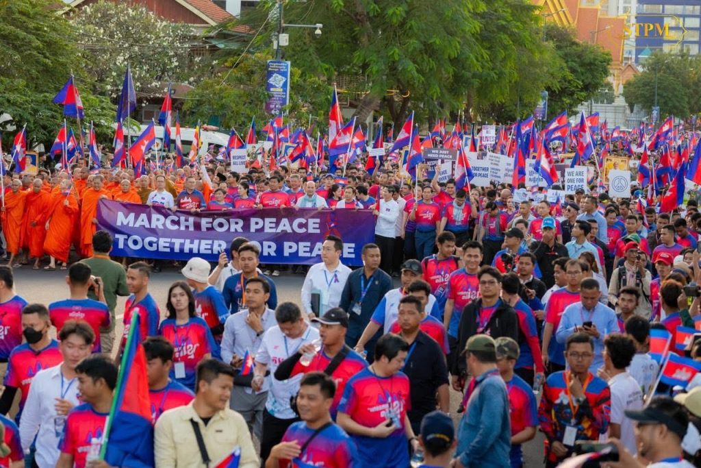 ប្រជាជនកម្ពុជាជាច្រើនពាន់នាក់ មានទាំងព្រះសង្ឃ អត្ដពលិក គ្រូបង្វឹក មន្ដ្រីកីឡាកម្ពុជា បានចូលរួមដើរដើម្បីសន្ដិភាព ក្រោមពាក្យស្លោក “កម្ពុជាត្រូវការសន្តិភាព” កាលពីថ្ងៃទី១៨ ខែធ្នូ ឆ្នាំ២០២៥ ចាប់ពីបរិវេណផ្សាររាត្រីមាត់ទន្លេ ឆ្ពោះទៅកាន់សួនច្បារវិមានឯករាជ្យ នាទីក្រុងភ្នំពេញ។